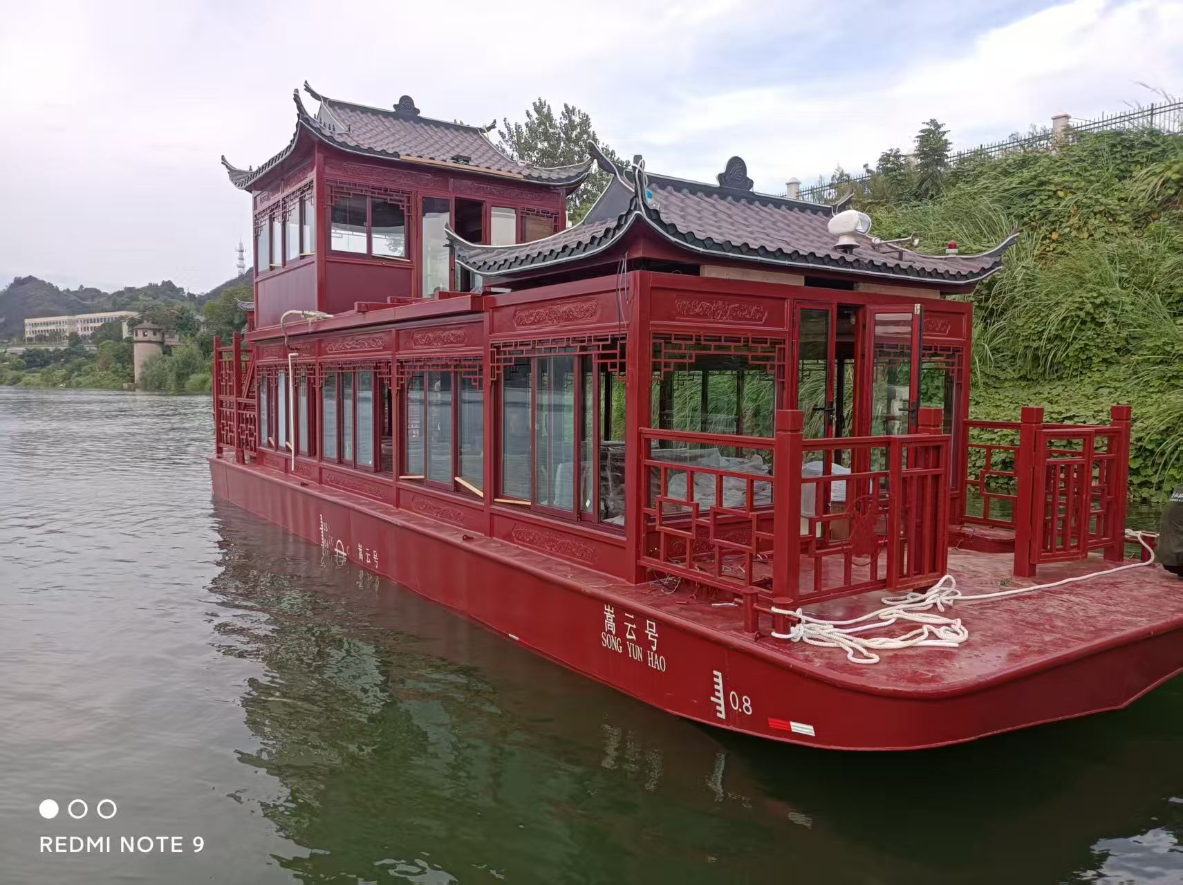 名称:TZN1480钢质新能源双层画舫艇 规格:14.8*4.1*6* 乘员:24+2人 配机:15KW无刷电机x2台 航速:10km/h 航区:内河C级